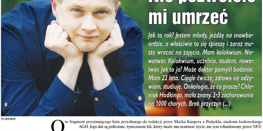 Nie będę opisywał jego historii. Zrobił to sam. Jego dramatyczny list opublikowaliśmy na pierwszej stronie Tygodnika Podhalańskiego. Nie dlatego by zaaplikować czytelnikom łzawą historię. Chodziło o walkę o życie chłopaka z Podwilka. Jedyny lek jaki daje szansę na wyleczenie jest nierefundowany przez NFZ. I kosztuje 300 tys. zł. Suma jak wyrok.