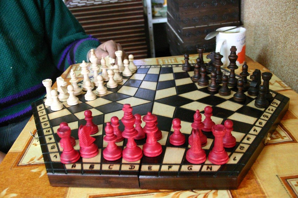 Ale co zrobić, by w grze dla trojga nie zaczęły tworzyć się sojusze by wyeliminować jednego przeciwnika? Wyjście okazało się wyjątkowo proste. Wystarczyła zasada, że wygrywa ten, kto zada pierwszego mata – pozostali dwaj przegrywają. I rzeczywiście to działa. Bo widząc, że zagrożony jest jeden z graczy muszę mu pomóc, by przedłużyć swoja szanse na zadanie mata.